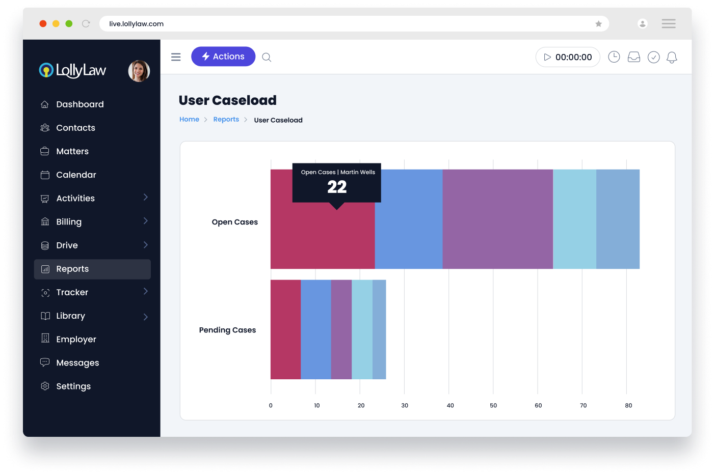 Use LollyLaw’s automated timers to capture and log billable time in just one click, and get paid for every minute you spend. Robust time reporting lets you know exactly how much time you and your staff are working on any given case.