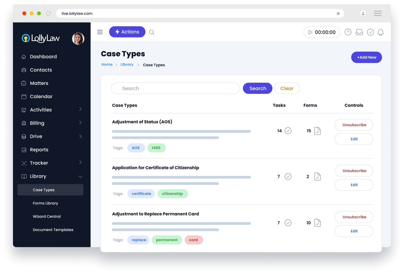 LollyLaw. We offer features not found in other legal practice management software. Our pre-built workflows are immigration-specific, and there are over 40 templates to choose from. You know the immigration process like the back of your hand, and LollyLaw equips you to streamline and standardize each step in that process to keep your staff, clients, and cases on track.