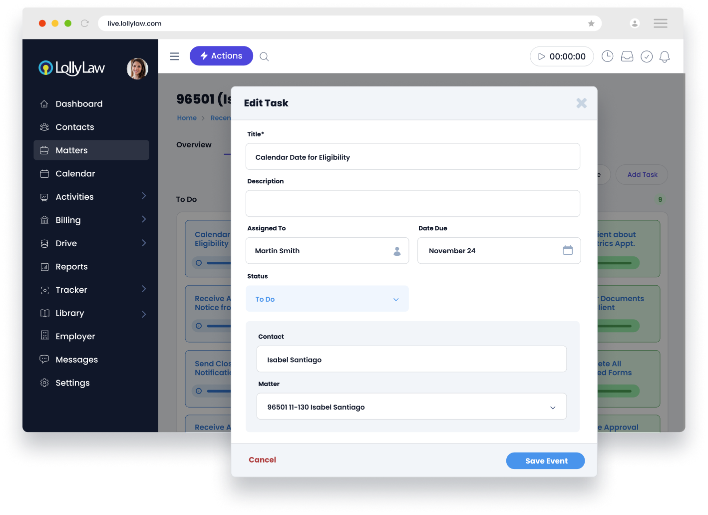 Disorganization makes it easy to fall behind — don’t put your firm’s reputation on the line. LollyLaw will instantly map your cases, tasks, deadlines, milestones, and any necessary forms which that specific case requires. Want to do things a little differently? The process steps in LollyLaw’s workflows are infinitely customizable — they’ll work exactly how you do.
