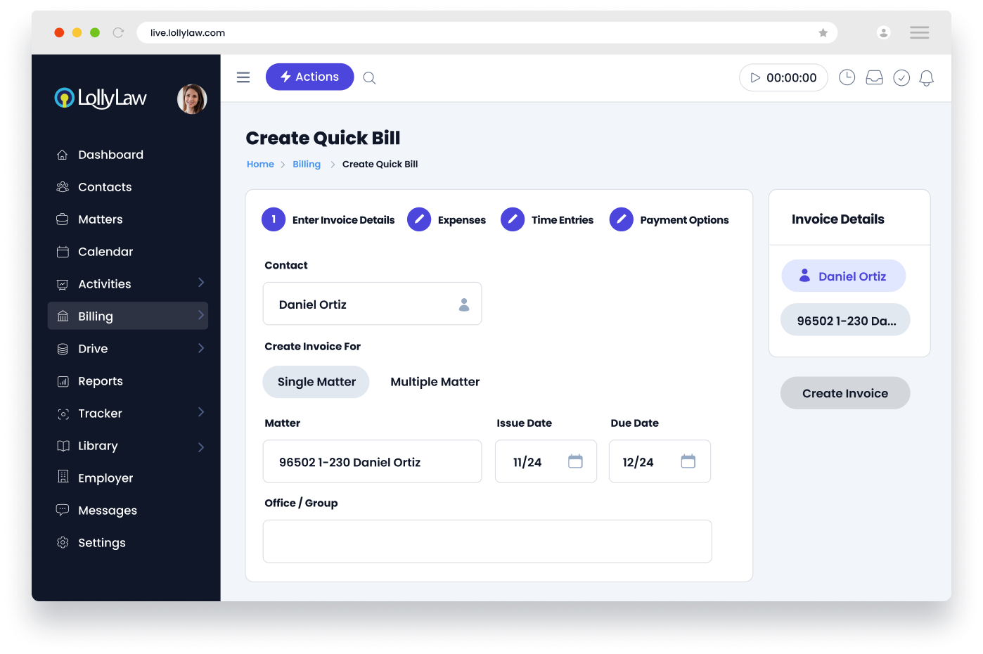 Delayed or missed payments are history when you sign on with LollyLaw. Integrating billing and invoicing onto one platform saves time and expedites payment collection.