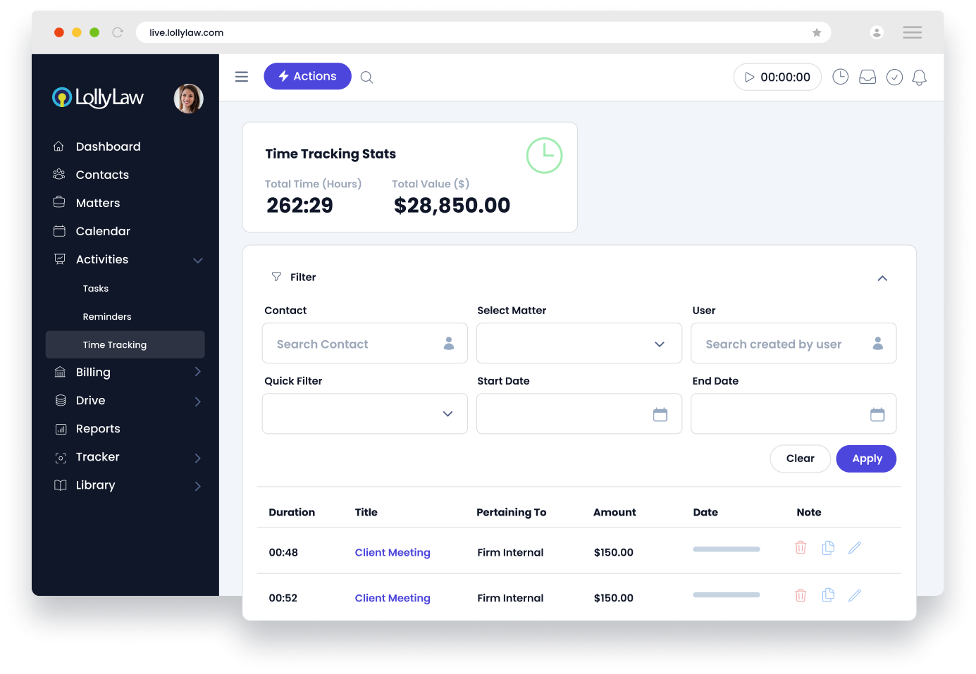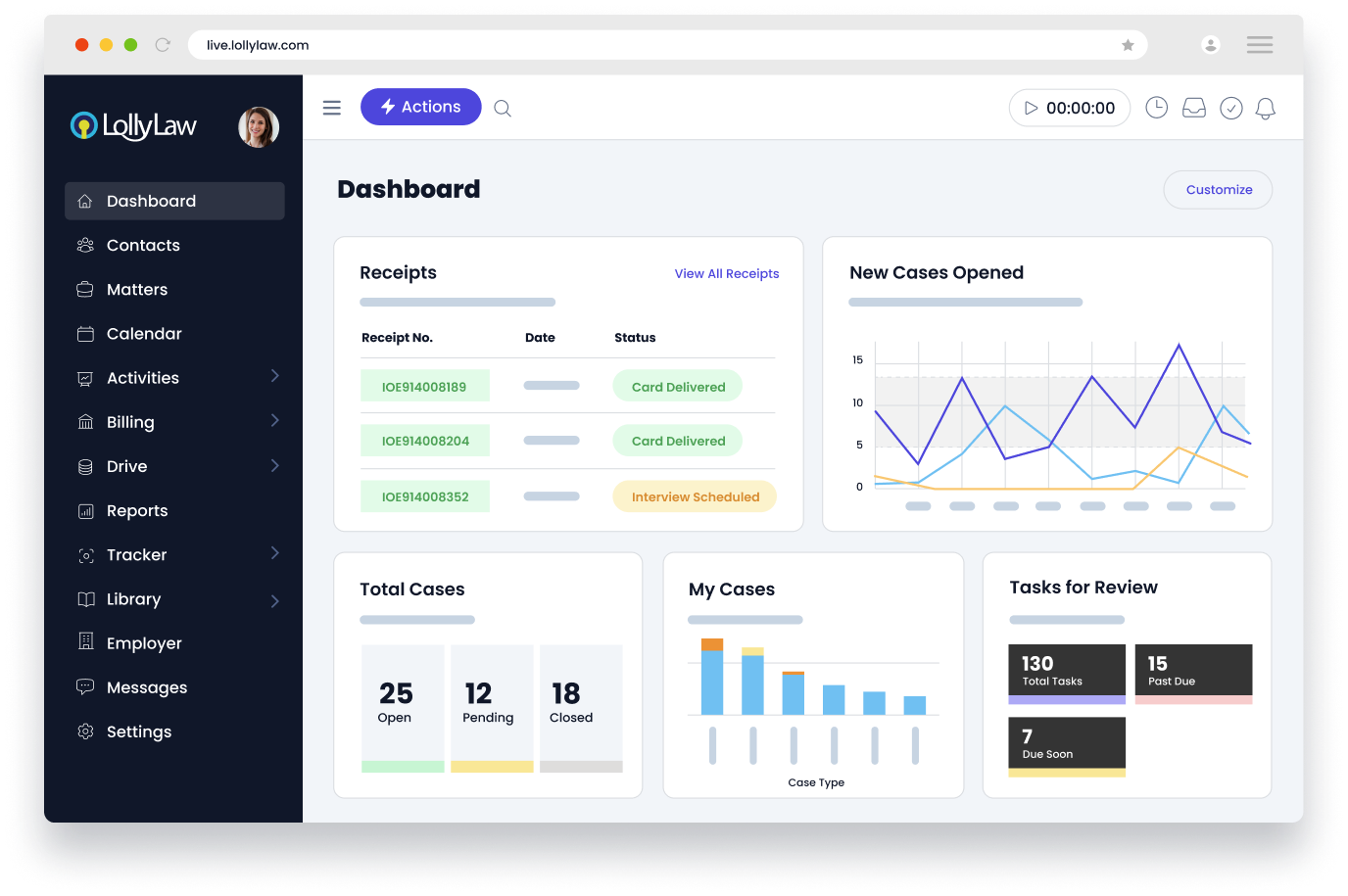 Track your time and bill clients with ease. LollyLaw automatically logs the time your staff works on each case and quickly generates easy-to-read invoices. Your team will love the simplicity and your clients will love the convenience.
